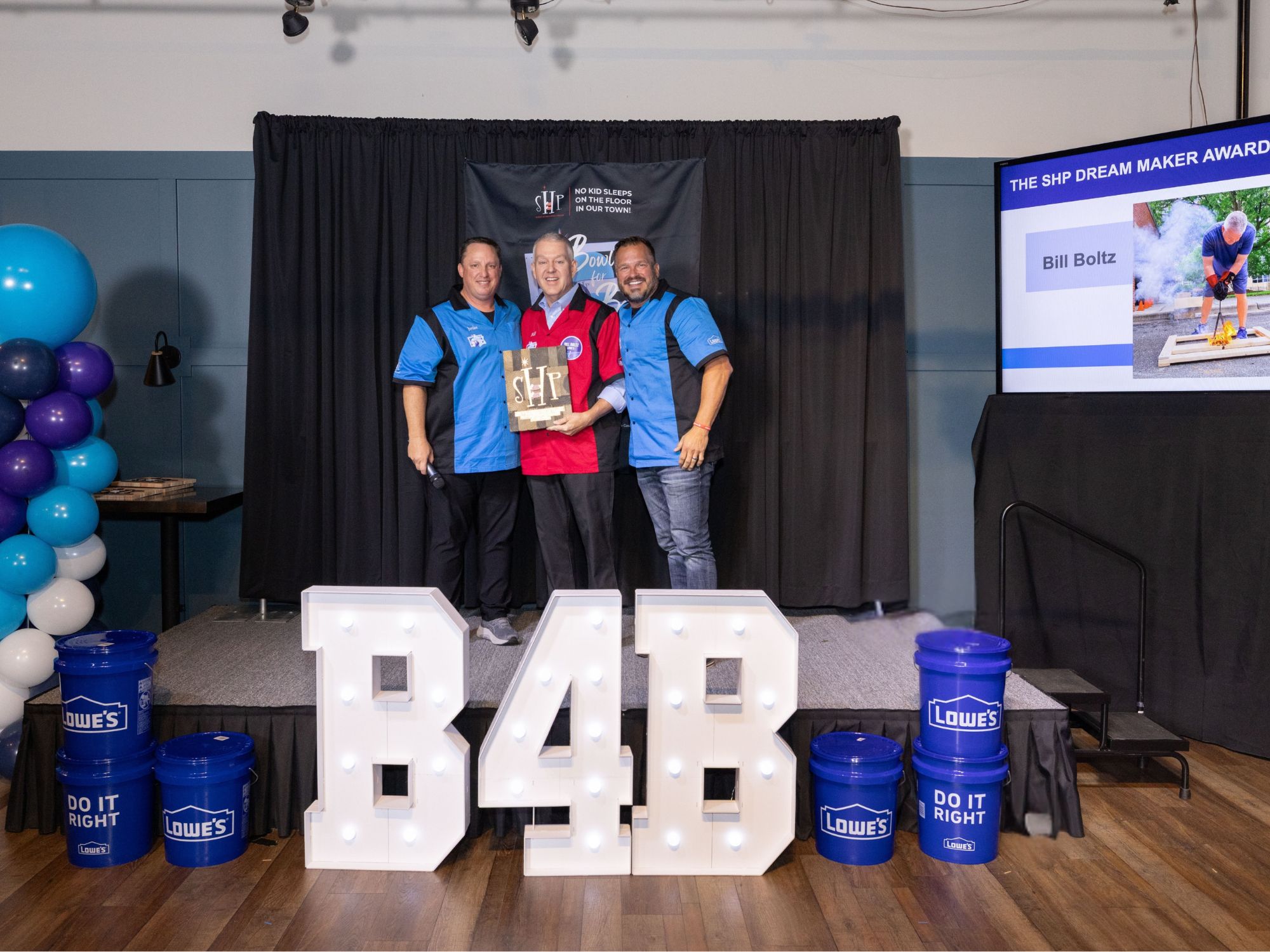 Sleep in Heavenly Peace's Jordan Allen (left) and founder Luke Mickelson (right) present Bill Boltz, EVP of merchandising at Lowe's, with SHP's 2025 "Dream Maker" award at the Bowling for Beds event that raised $580,000 for beds.