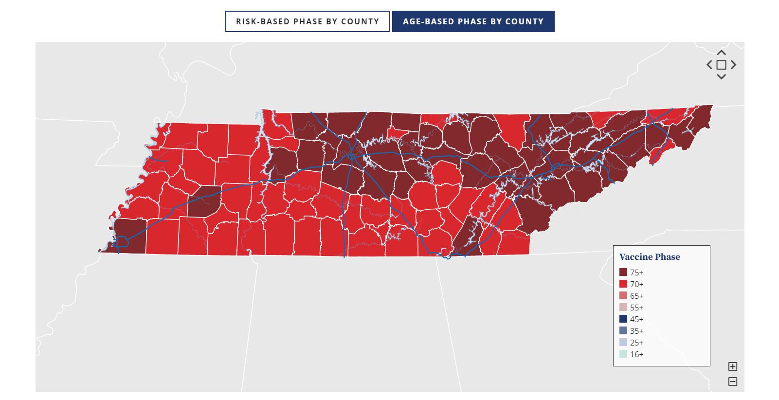 It is important to note Tennessee counties may progress through vaccination phases at different times, depending on supply of the COVID-19 vaccines and demand for them. To learn what phase your county is in, visit https://covid19.tn.gov/covid-19-vaccines/vaccine-phases/.”