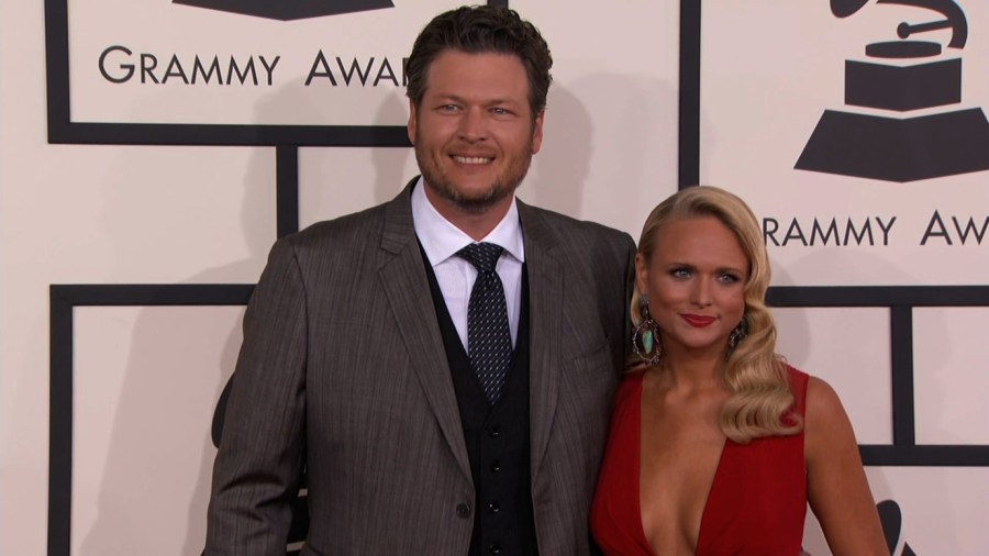 Miranda Lambert and Blake Shelton walk the red carpet at the 56th Annual Grammy Awards.