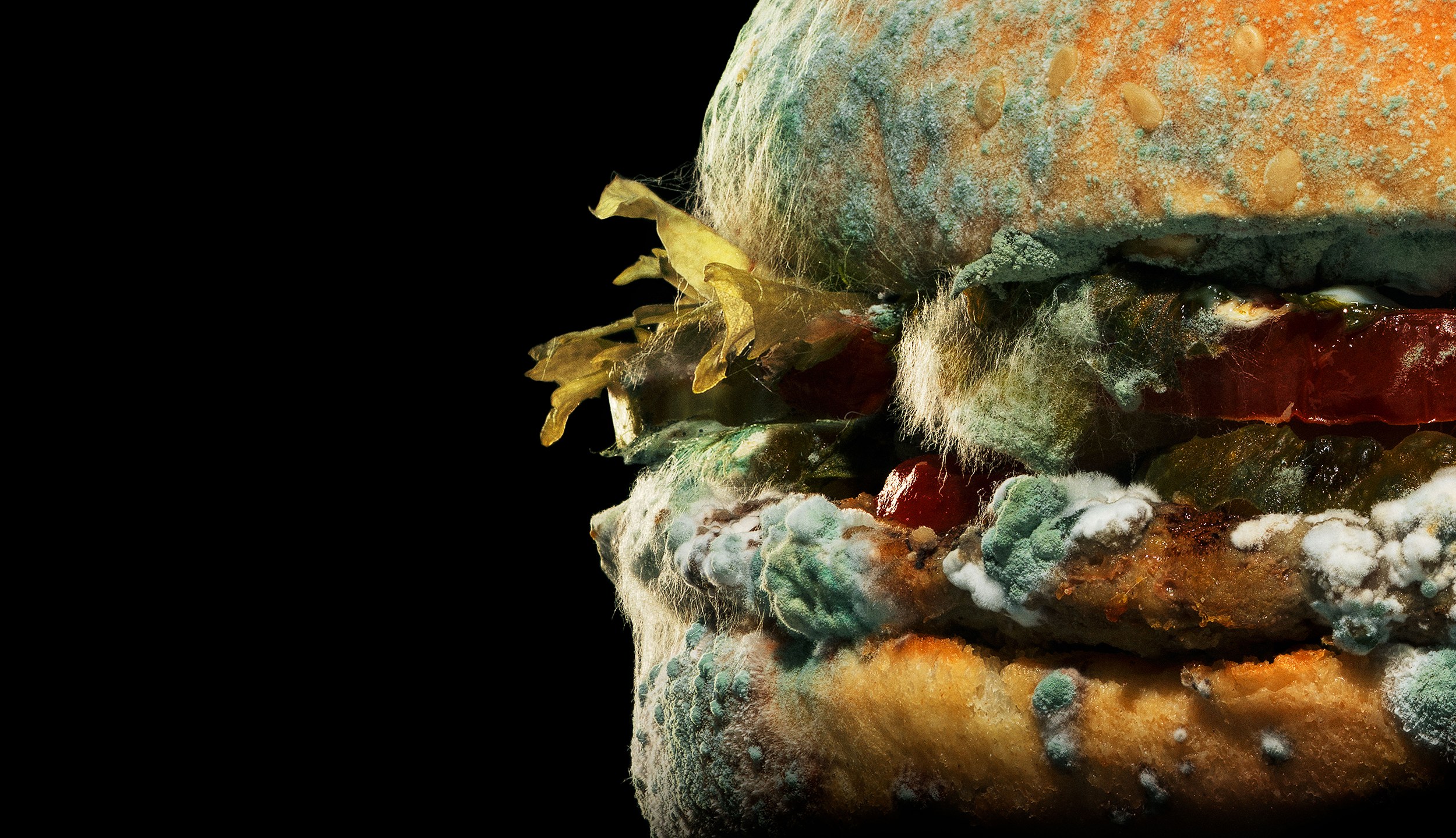 The unconventional marketing effort includes a TV commercial showing the all-natural Whopper slowly rotting over the course of 34 days as soul singer Dina Washington’s 1959 hit “What a Difference A Day Makes” plays in the background. Deliberately absent are food coloring and special effects commonly used to make restaurant meals and their ingredients look appetizing in commercials. By the end of the 45-second commercial, the Whopper has transformed into a green and blue mess.