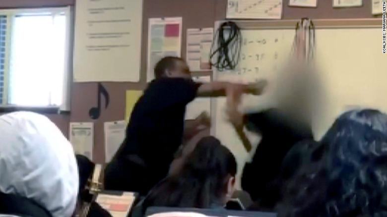 (CNN)- A teacher and student at a southeast Los Angeles, California, high school came to blows Friday afternoon, and it was all caught on video.