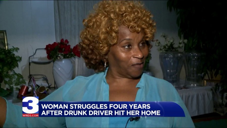 Four years to the day after a drunk driver plowed into her home the house has never been properly fixed and tonight she’s living in a danger zone.