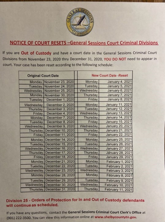Cases have already been reset for those individuals who are currently out of custody who were scheduled to appear in the General Sessions Criminal Court Divisions from Nov. 23 to Dec. 31.