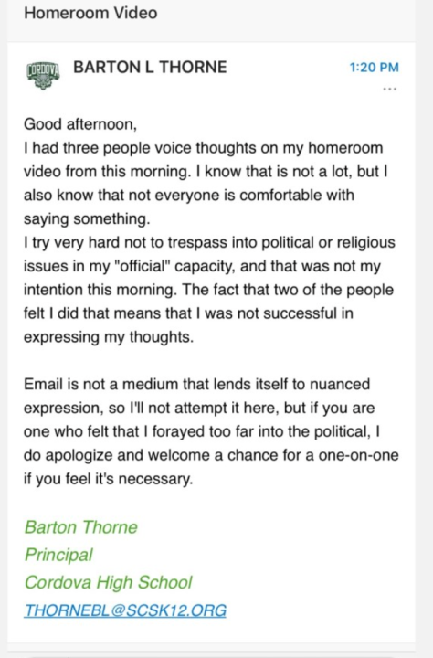Thorne, who’s been principal at Cordova High School for about three years reportedly made the remarks during the video, which went out to Cordova High students. Thorne stressed his comments weren’t about President Trump, but more so about freedom of speech.