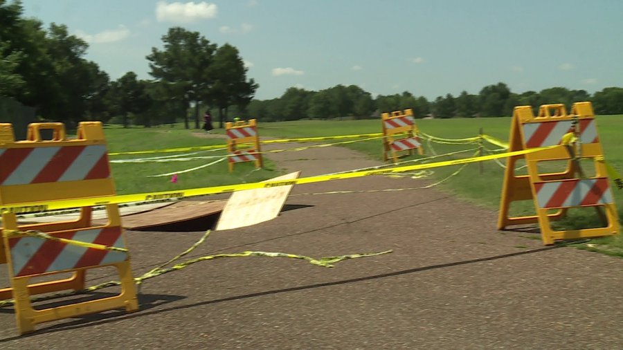 CORDOVA, Tenn. — A popular walking trail at a popular park in Cordova is partially swallowed up by a massive hole.