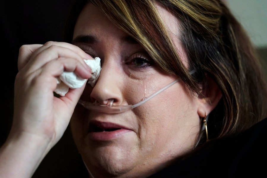 FILE - In this Wednesday, Aug. 18, 2021 file photo, Lauren Debroeck, who is on oxygen as she recovers from COVID-19, cries as she talks about her family, at the bedside of her husband, Michael, who also contracted COVID-19 and is being kept alive with the help of an oxygenation machine, at the Willis-Knighton Medical Center in Shreveport, La. The COVID-19 surge is stretching oxygen supplies and sending hospitals scrambling for more ventilators, even as there are signs of hope that the spread of the virus is slowing down in pockets of the U.S. (AP Photo/Gerald Herbert, File)