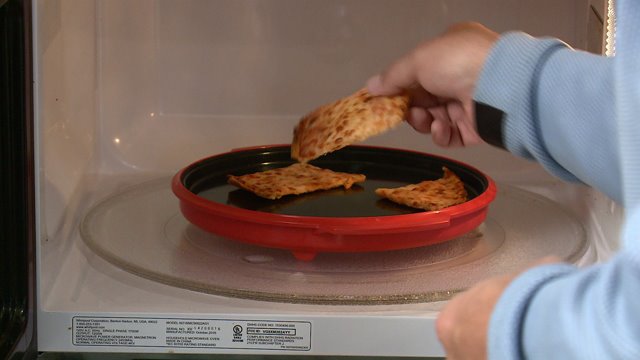 As the instructions stated, Fischer preheated the base of the pan in the microwave for two minutes. Then placed three slices in the pan, placed the lid on top and cooked it for two minutes. Using potholders, Fischer removed the Reheatza from the microwave and placed it on the counter.