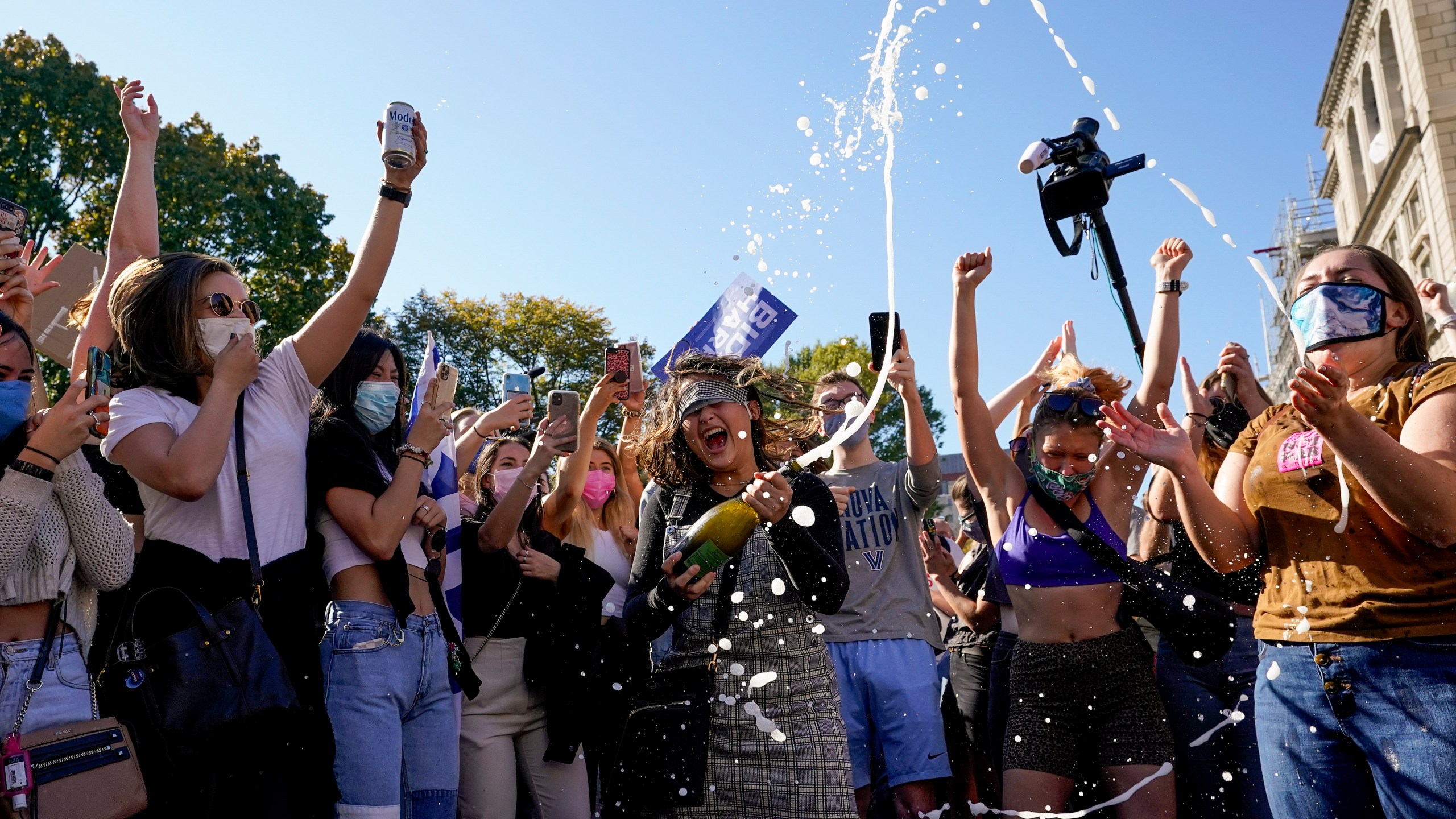 People waved Biden signs from balconies and banged pots and pans. A pickup truck drove around Washington with a band playing in the bed. In Manhattan, they danced in the streets, banged cowbells and honked their car horns. In Louisville, Kentucky, Biden supporters gathered on their lawns to toast with champagne.