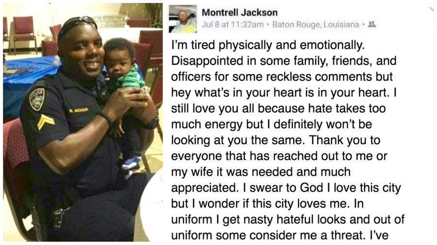 BATON ROUGE, La. — One of the three officers killed on Sunday has been identified as Montrell Jackson — a 10-year-veteran who recently shared a powerful Facebook post about the physical and emotional hurdles of being an officer after Alton Sterling’s death.
