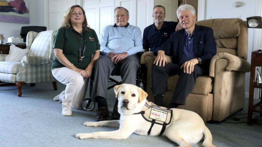 Former President George H.W. Bush, second left, poses for a photo with Sully, a yellow Labrador retriever who’ll be his first service dog at his home in Kennebunkport, Maine, Monday, June 25, 2018. The 94-year-old and his new companion got acquainted Monday at the Bush family compound on the coast of Maine. Photographed with Bush are Valerie Cramer, from left, Brad Hubbard, from America’s VetDogs, and former President Bill Clinton, visiting Bush. Sully was trained by the nonprofit that provides service dogs. (Evan F. Sisley/Office of George Bush via AP)