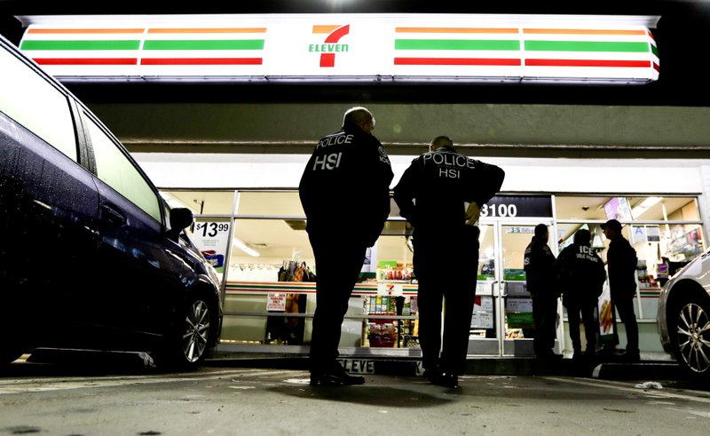 U.S. Immigration and Customs Enforcement agents serve an employment audit notice at a 7-Eleven convenience store Wednesday, Jan. 10, 2018, in Los Angeles. Agents said they targeted about 100 7-Eleven stores nationwide Wednesday to open employment audits and interview workers. (AP Photo/Chris Carlson)