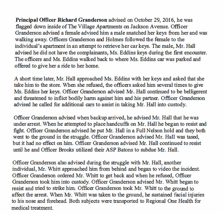 However, Granderson told MPD’s internal affairs he felt Hall was “belligerent and threatened to inflict bodily harm against him and his partner.” He said “when backup arrived,” he advised Hall “he was under arrest.”
