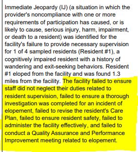 It was cited with what’s called Immediate Jeopardy (the most serious type of violation) for health citations related to Substandard Quality of Care.