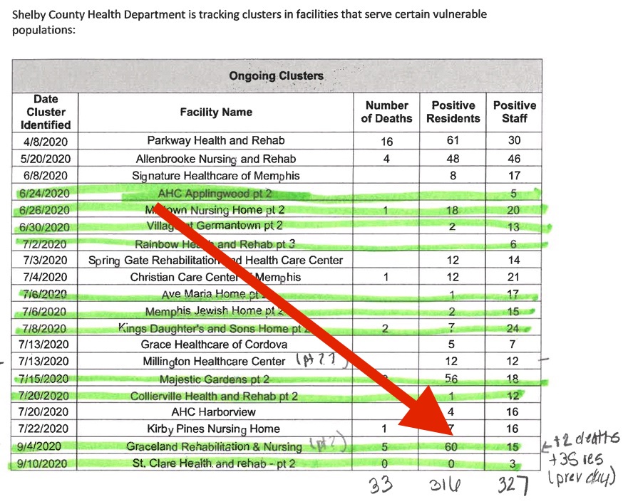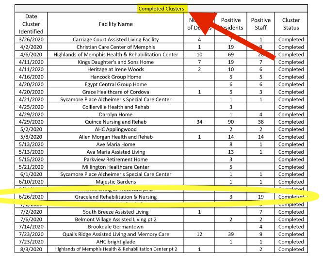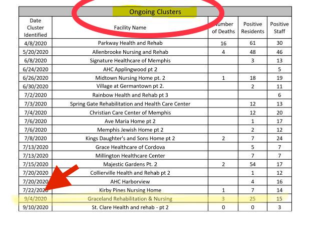 According to the Shelby County Health Department, a cluster is considered resolved once a facility has gone 28 days without a new case. But subsequent testing may have revealed a new cluster.