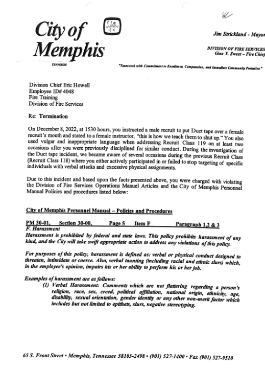 Eric Shane Howell, a Memphis Fire division chief, is said to have violated five personnel policies, including harassment.