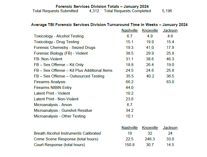 As of January, the TBI reports on average, a six-month turnaround time to process forensic biology in violent crimes, four to six months for rape kits and almost 16 months for firearms analysis.