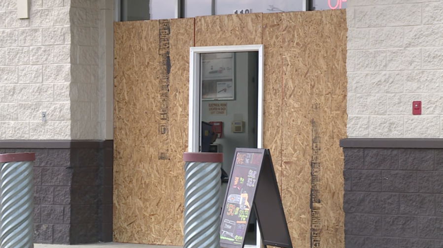A witness told officers he saw a two vehicles, possibly a red Nissan Maxima and a white pickup truck, after hearing a loud bang. The front and back doors of the business were damaged.