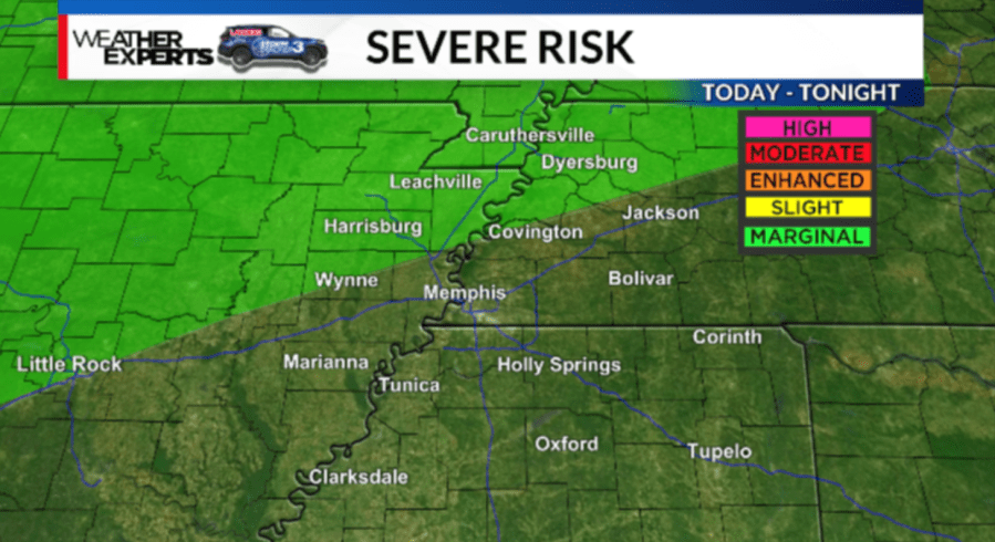 MEMPHIS, Tenn. — There is a marginal risk for severe weather in the Mid-South on Tuesday, mainly north of Shelby County.