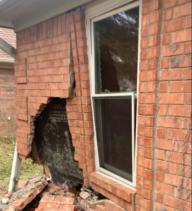 Police are still looking for the driver who knocked off brick siding and moved the front wall of a house at Stonington and Pinegate Drives at around 6 p.m. November 23.