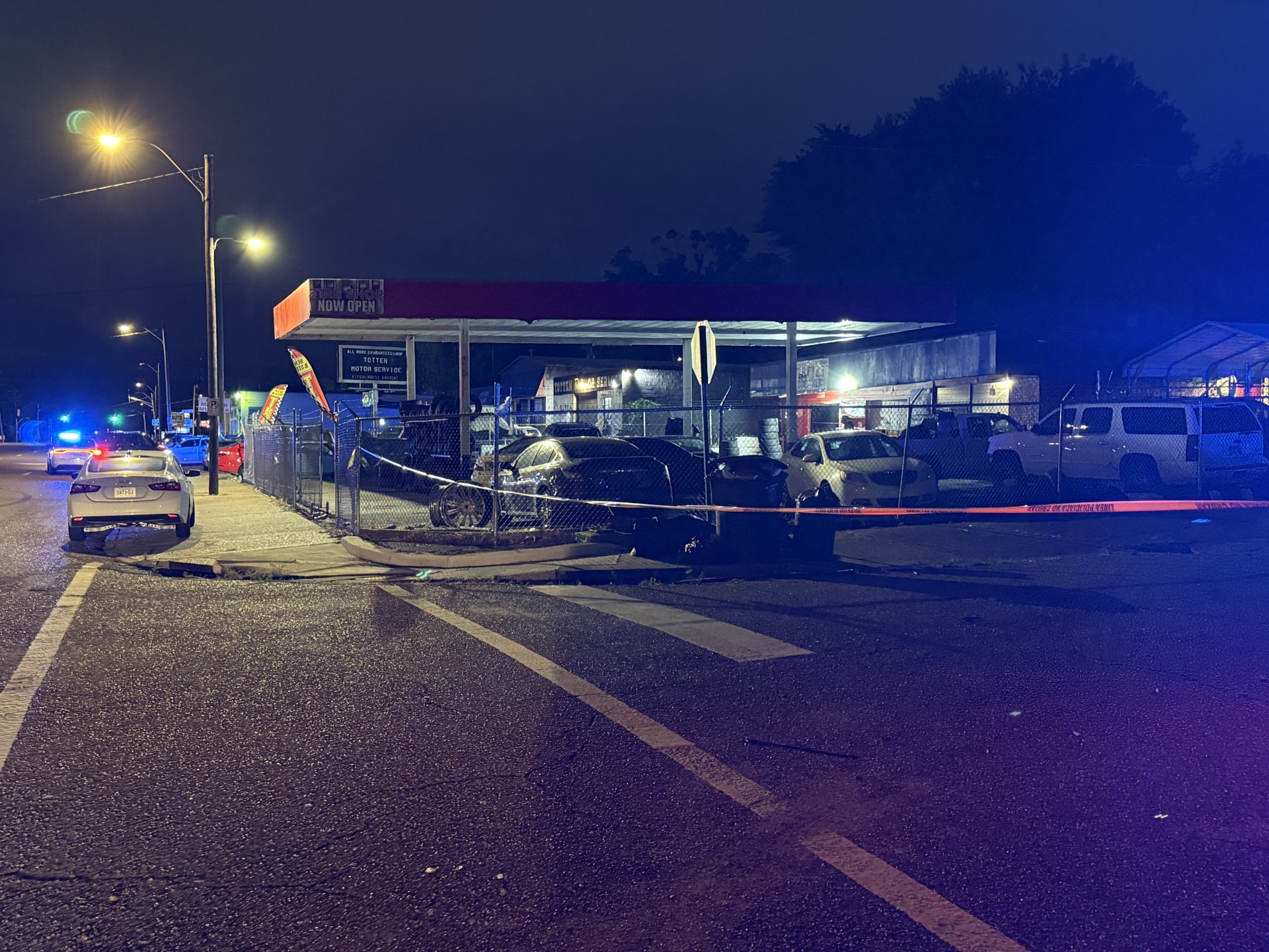 Multiple police cars and crime scene tape were seen in the area of East Davant Avenue in front of a tire shop in the 2100 block of South Third Street. Police responded to the shooting around 1:30 a.m.
