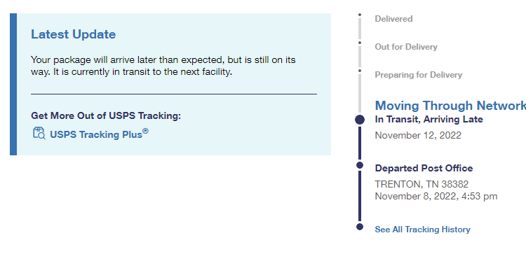 The tracking history shows his problems with the mail began in late September. It shows all the parcels departed the post office in Trenton, but weeks later, they are still moving through the network.