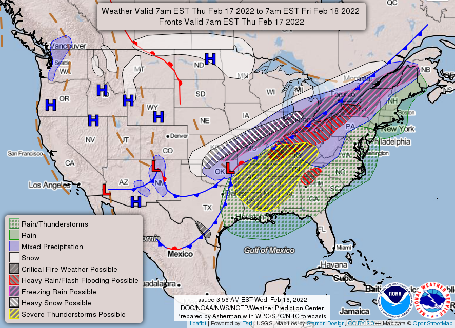 UPDATE 8:40 AM: A marginal risk of flash flooding and a wind advisory is in effect Thursday through 9 PM, according to the National Weather Service. All modes of severe storms are possible, including damaging winds, hail, localized flooding and the possibility of a strong tornado.