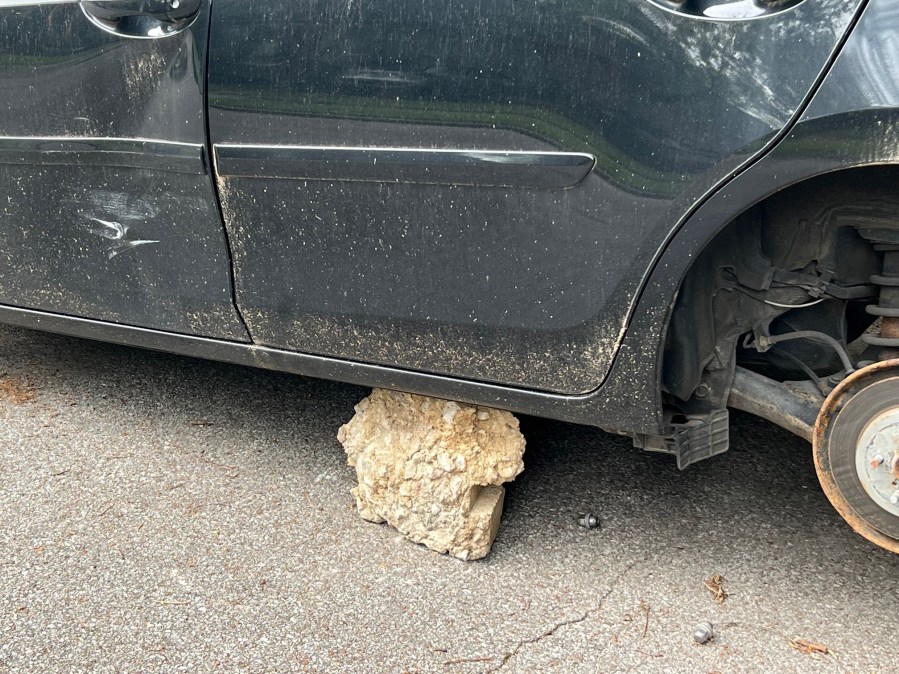 When Robin Waters discovered the damage Monday morning, the Toyota Corolla was being propped up by nothing more than a cinder block and a piece of broken concrete.