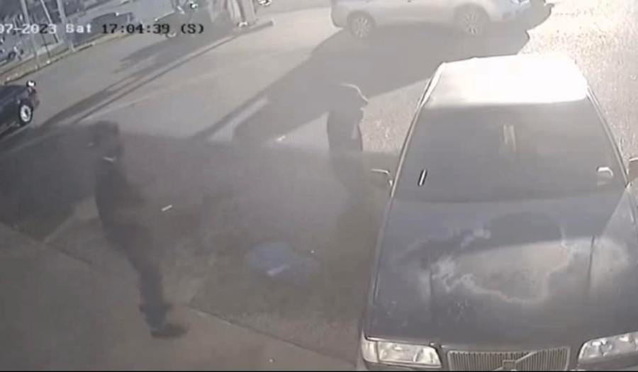 In the store’s surveillance video, you can see the robber approach the victim as he begins to unlock a passenger side door of his vehicle. The suspect pushed the victim against the car and appeared to go through his pockets.