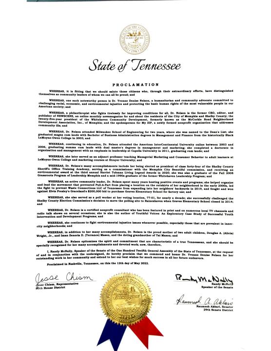 According to the proclamation below, Dr. Nelson led the fight to prevent a major waste company from expanding into her neighbors’ backyards in 2019, and fought and won against Elvis Presley’s Graceland’s $200,000 bid to purchase Graves Elementary School for factory use in 2020.