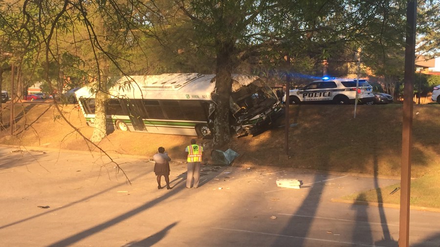 The bus ran off the road and struck a tree on Poplar Avenue and Exeter Road.
