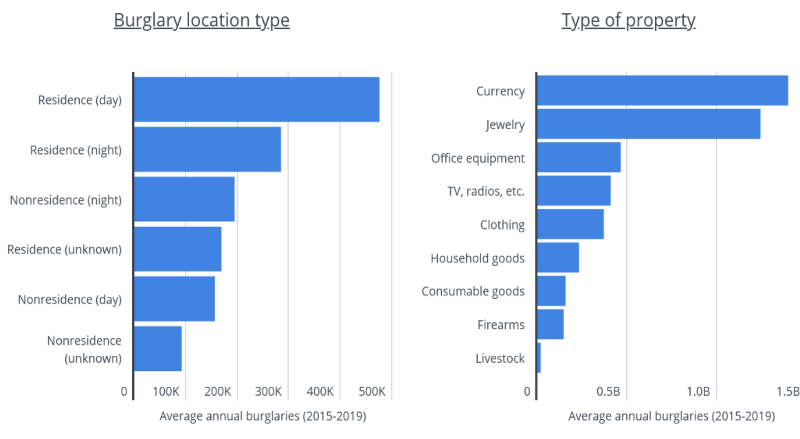 Once in, thieves were most likely to take money or jewelry. Together, those valuables were worth more than the other top categories of stolen goods combined. Those items included electronics, office equipment, and clothing.