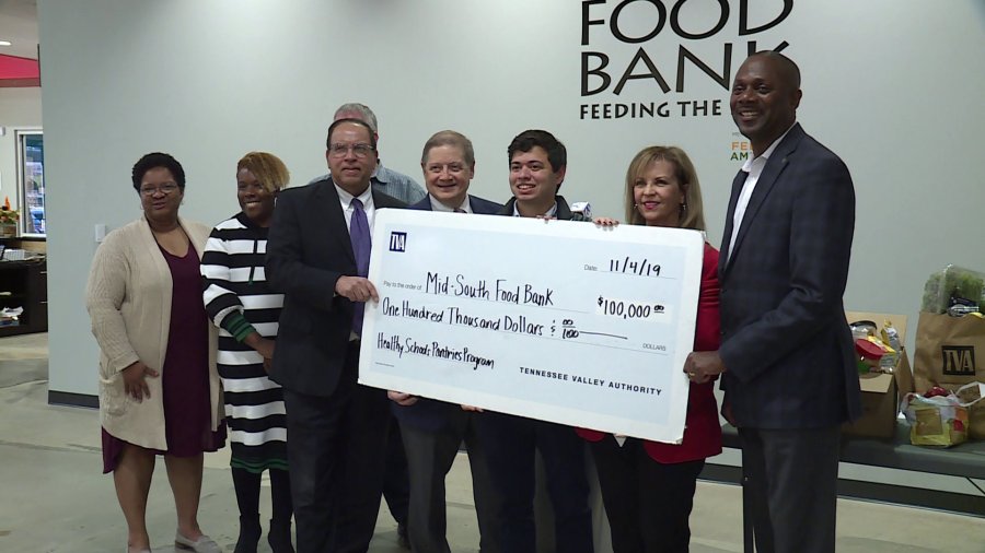 Board members from the TVA, including WREG General Manager Ron Walter, presented a check for $100,000 to representatives from the school and the Mid-South Food Bank.