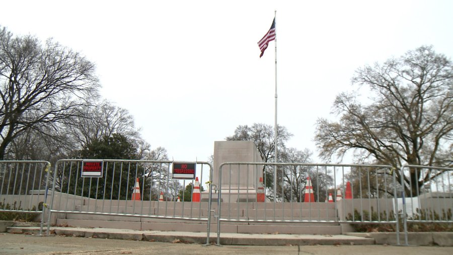 A barricade surrounds the foundation where a monument to Confederate Gen. Nathan Bedford Forrest used to stand in Memphis.