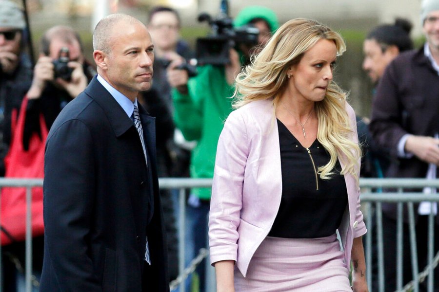 FILE - Stormy Daniels and her attorney Michael Avenatti leave federal court in New York, on April 16, 2018. Avenatti was sentenced Thursday, June, 2, 2020, to four years in prison for cheating client Stormy Daniels, the porn actor who catapulted him to fame, of hundreds of thousands of dollars in book proceeds. (AP Photo/Seth Wenig, File)