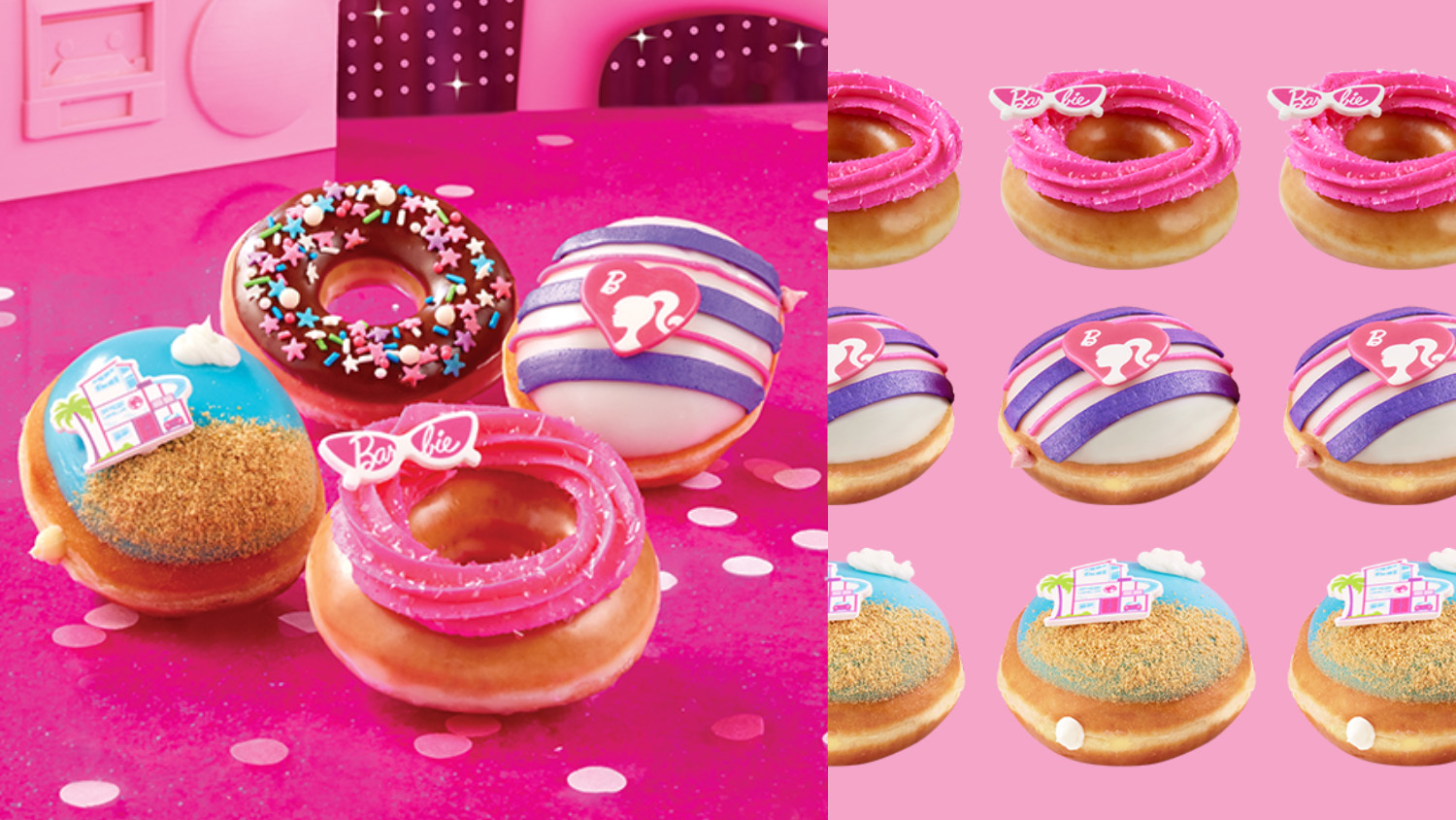 And the Barbie Pink Doughnut is an Original Glazed Doughnut piped with pink buttercream, topped with sparkling pink sugar and a candy pair of Barbie’s iconic cat-eye sunglasses.