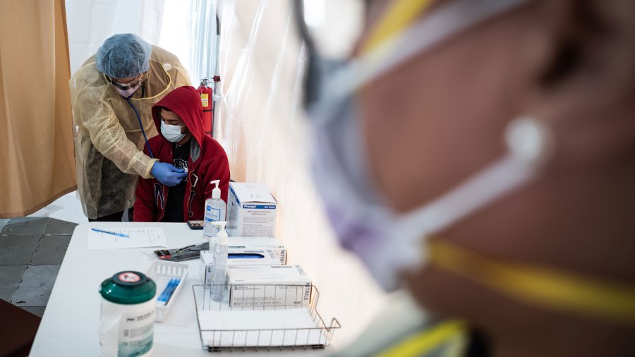 NEW YORK, NY - MARCH 20: A doctor examines Juan Vasquez for a COVID-19 test inside a testing tent at St. Barnabas hospital on March 20, 2020 in New York City. St. Barnabas hospital in the Bronx set-up tents to triage possible COVID-19 patients outside before they enter the main Emergency department area. (Photo by Misha Friedman/Getty Images)