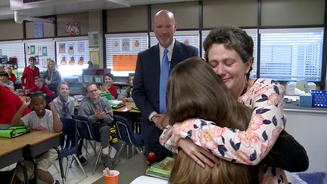 The class of students at Richland Elementary School applaud their teacher for a well deserved honor.