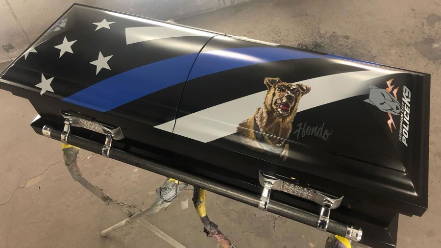 Twenty-four hours later, Rawtin revealed the special casket. Its custom design, all hand painted or airbrushed, included a portrait of Hondo wearing his police harness.