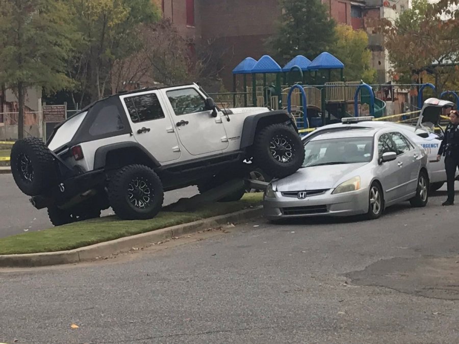 The officers then gave chase and the suspects wrecked in the 2600 block of Douglass, near the Orange Mound Community Center. The Jeep landed on top of a silver car and took out a lamp post.