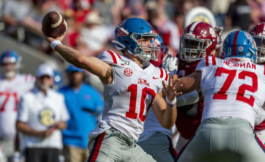 Mississippi quarterback John Rhys Plumlee (10) throws against Alabama during the first half of an NCAA college football game, Saturday, Sept. 28, 2019, in Tuscaloosa, Ala. (AP Photo/Vasha Hunt)