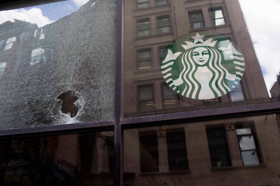 NEW YORK, NY - JUNE 1: A broken glass of a Starbucks is seen after a protest against the death in Minneapolis police custody of George Floyd at SoHo neighborhood on June 1, 2020 in the Soho neighborhood of New York City. New York City is under a curfew from Monday night to curb violent protests following the death of black man George Floyd, according to a joint statement by Mayor Bill de Blasio and New York State Governor Andrew Cuomo on Monday. (Photo by Andrew Lichtenstein/Corbis via Getty Images)