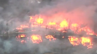 The fire started about 5 p.m. Sunday and quickly spread, charring more than 30 cabins and turning propane tanks into shrapnel.