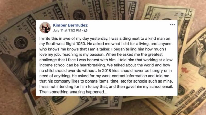 Teacher brought to tears on flight when strangers give over $500 after hearing her passion
