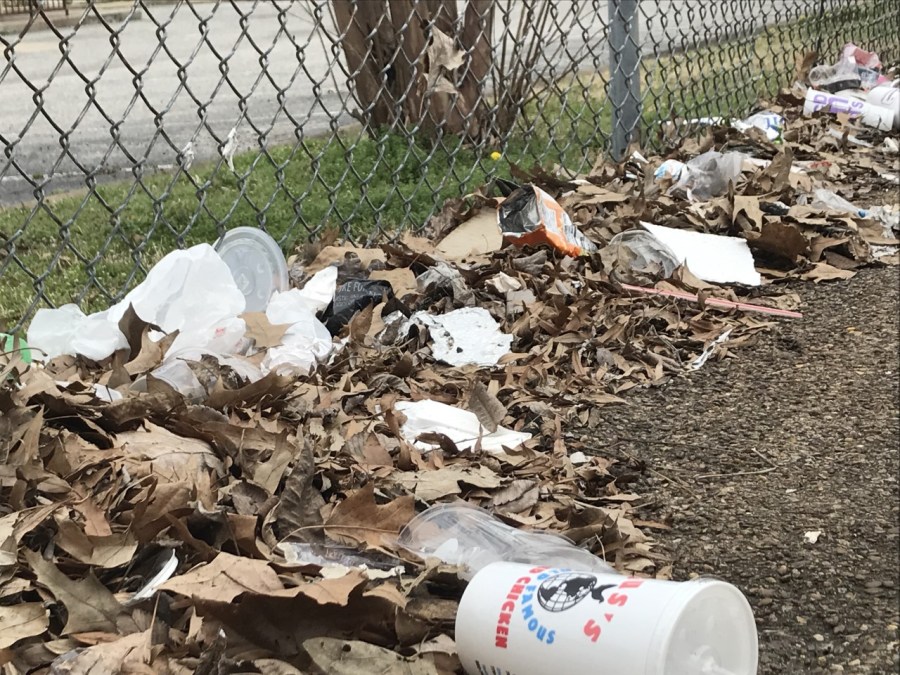Litter along a fence behind businesses on Highland.