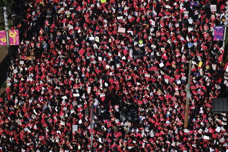 Thousands of striking Los Angeles Unified teachers gather in front of Los Angeles City Hall on Tuesday, Jan. 22, 2019. (AP Photo)