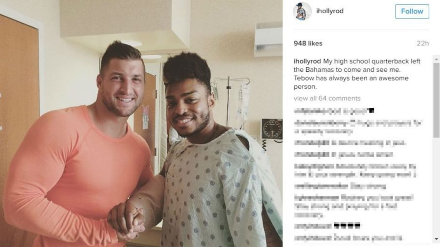 During the visit Tuesday, Sumter took a photo with Tebow. Sumter posted the photo on Instagram, adding “My high school quarterback left the Bahamas to come and see me. Tebow has always been an awesome person,”