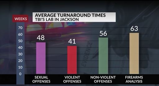 As of December 2022 on average, it took scientists more than 48 weeks to process forensic biology for sexual offenses at the Jackson lab — 41 weeks for violent offenses, and 56 weeks for non-violent. Firearms analysis took the longest at 63 weeks.