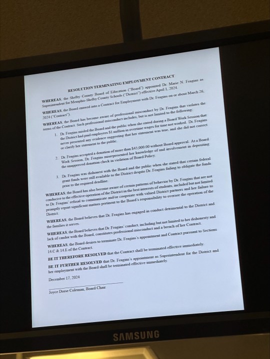 The MSCS board presented this resolution as reasons to terminate Dr. Feagins’ contract. (MSCS)