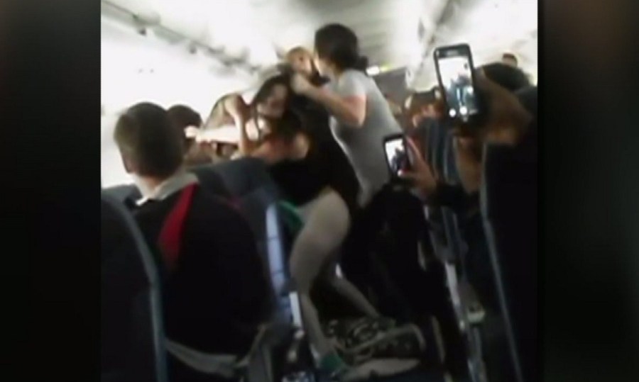 The video shows a group of women throwing punches and pulling each other’s hair as startled passengers looked on.