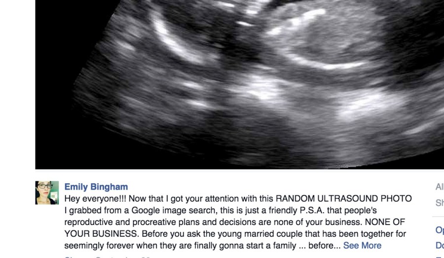 In Emily Bingham’s post, she wrote “this is just a friendly P.S.A. that people’s reproductive and procreative plans and decisions are none of your business. NONE OF YOUR BUSINESS.